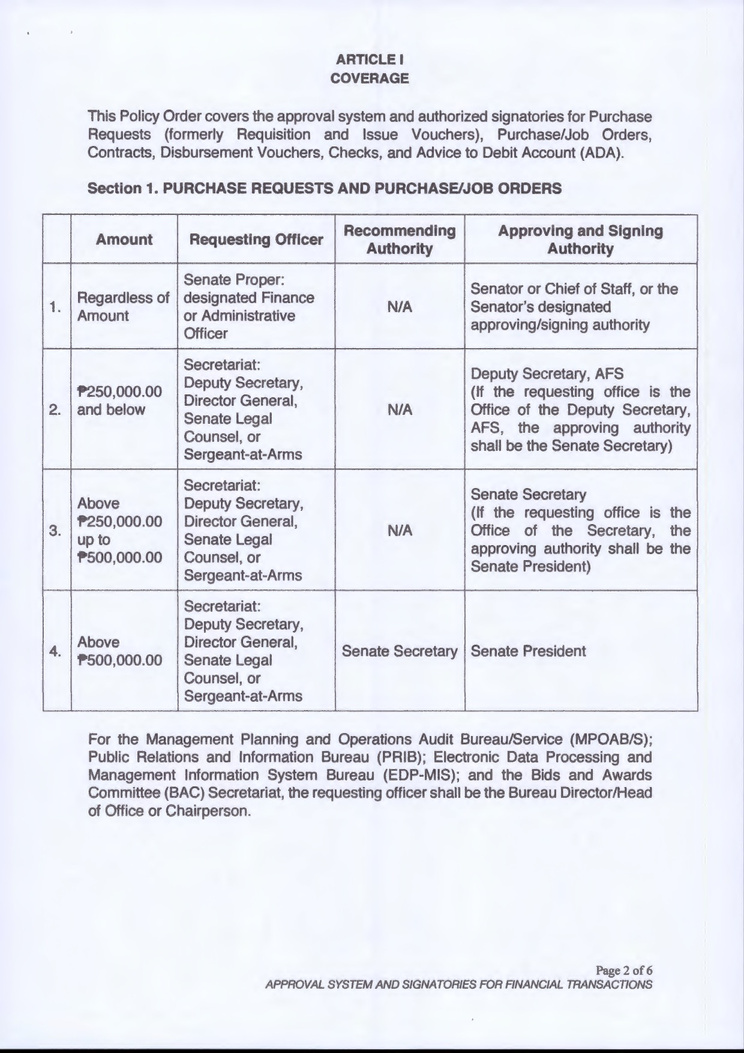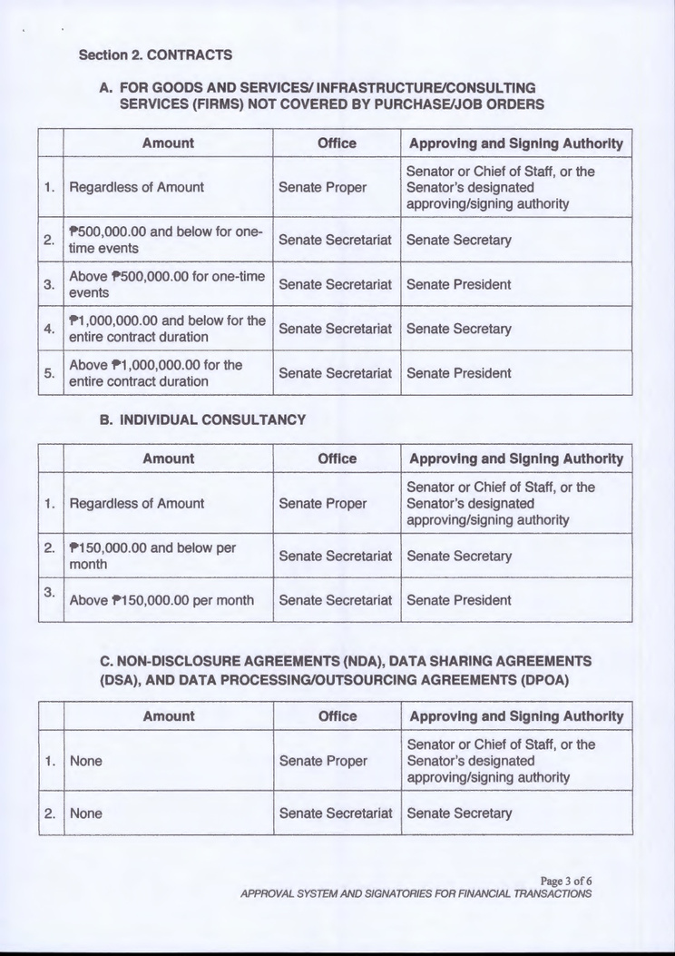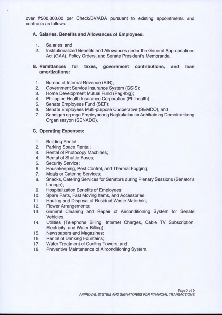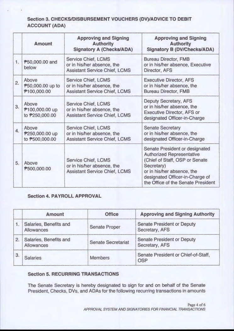 The Payroll Disbursement Section handles the payment of salaries and other payroll payments to the Senate officers, employees and consultants. Payroll transactions are paid through the Land Bank Automated Teller Machine (ATM) for Senate Secretariat officers and employees, and over-the-counter or cash payment for the staff of the Senators.