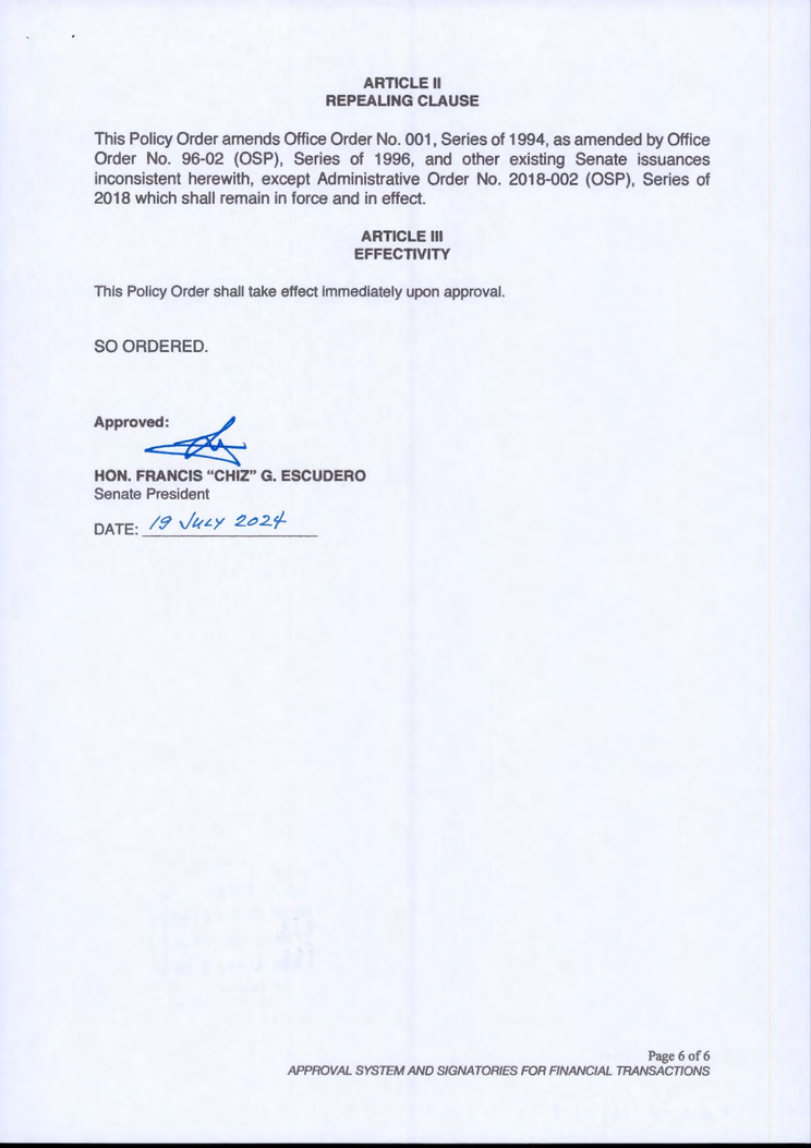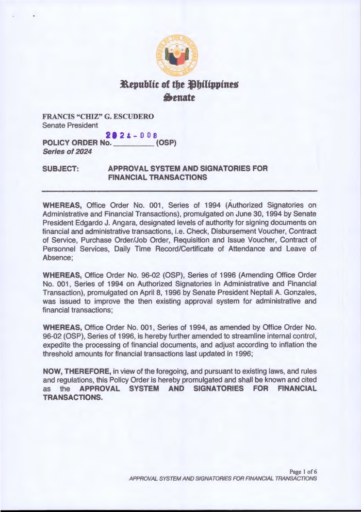 Request for authority to hold cash advance for Revolving Fund (Overtime Pay/Petty Cash Fund). A Special Order (SO) is issued by the Office of the Senate President (OSP).